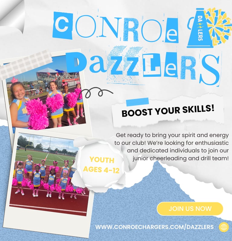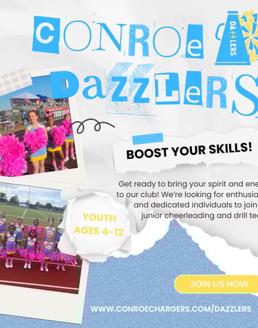 Our goal is to provide a fun and supportive environment for young cheerleaders to learn and grow. We would be delighted to have you become a part of Dazzlers Family! If you have any questions, feel free to reach out to our drill director, Jeri Walter, at conroedazzlers@gmail.com.