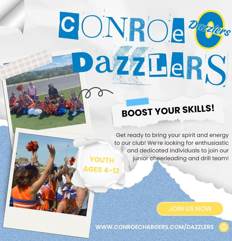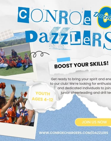 Our goal is to provide a fun and supportive environment for young cheerleaders to learn and grow. We would be delighted to have you become a part of Dazzlers Family! If you have any questions, feel free to reach out to our drill director, Kaylee Arteaga, at conroedazzlers@gmail.com.